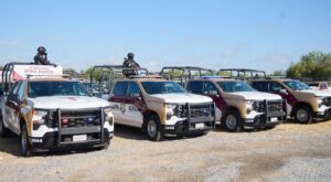 Un total de 63 unidades, entre ellas patrullas, entregó ayer el gobernador Américo Villarreal a la Guardia Estatal y a la Fiscalía General de Justicia del Estado en un evento realizado en Miguel Alemán.