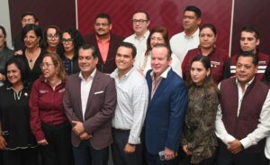 En rueda de prensa, acompañaron al expresidente de la mesa directiva de la Cámara de Diputados la lideresa estatal de Morena, Lupita Gómez; y el coordinador del Grupo Parlamentario de Morena en el Congreso del Estado, Humberto Prieto.